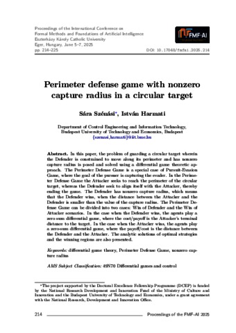 Szénási, Sára and Harmati, István (2025) Perimeter defense game with nonzero capture radius in a circular target. In: Proceedings of the International Conference on Formal Methods and Foundations of Artificial Intelligence. Eszterházy Károly Katolikus Egyetem Líceum Kiadó, Eger, pp. 214-225. ISBN 9789634963035