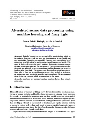 Balogh, János Dávid and Adamkó, Attila (2025) AI-assisted sensor data processing using machine learning and fuzzy logic. In: Proceedings of the International Conference on Formal Methods and Foundations of Artificial Intelligence. Eszterházy Károly Katolikus Egyetem Líceum Kiadó, Eger, pp. 23-37. ISBN 9789634963035