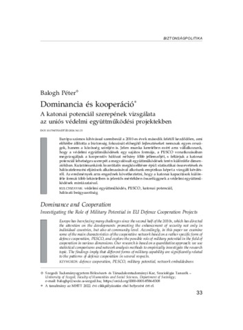 Európa számos kihívással szembesül a 2010-es évek második felétől kezdődően, ami előtérbe állította a biztonság fokozását elősegítő fejlesztéseket nemcsak egyes országok, hanem a közösség szintjén is. Jelen munka keretében ezért arra vállalkozunk, hogy a védelmi együttműködések egy sajátos formája, a PESCO vonatkozásában megvizsgáljuk a kooperatív hálózat néhány főbb jellemzőjét, s feltárjuk a katonai potenciál lehetséges szerepét a megvalósult együttműködések terén különféle dimenziókban. Kutatómunkánk kvantitatív megközelítésre épül: statisztikai összevetések és hálózatelemzési eljárások alkalmazásával alkotunk empirikus képet a vizsgált kérdésről. Az eredmények arra engednek következtetni, hogy a katonai kapacitások különféle formái több tekintetben is jelentős mértékben összefüggnek a védelmi együttműködések mintázataival. | Europe has been facing many challenges since the second half of the 2010s, which has directed the attention on the developments promoting the enhancement of security not only in individual countries, but also at community level. Accordingly, in this paper we examine some of the main characteristics of the cooperative network based on a rather specific form of defence cooperation, PESCO, and explore the possible role of military potential in the field of cooperation in various dimensions. Our research is based on a quantitative approach: we use statistical comparisons and network analysis methods to empirically investigate the research topic. The findings imply that different forms of military capability are significantly related to the patterns of defence cooperation in several respects.