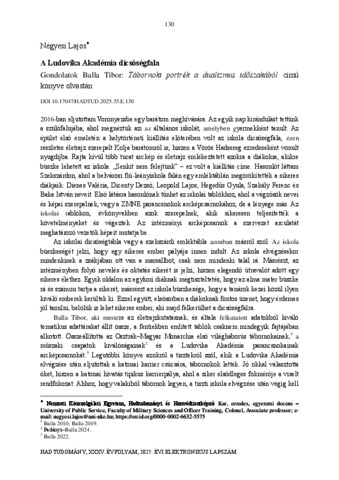 Négyesi, Lajos (2025) A Ludovika Akadémia dicsőségfala : Gondolatok Balla Tibor: Tábornoki portrék a dualizmus időszakából című könyve olvastán. HADTUDOMÁNY, 35 (E-szám). pp. 130-136. ISSN 1215-4121 (nyomtatott); 1588-0605 (elektronikus)