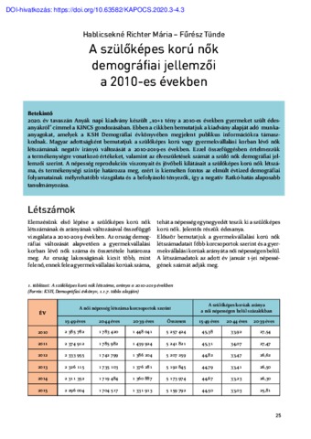 Hablicsekné Richter, Mária and Fűrész, Tünde (2020) A szülőképes korú nők demográfiai jellemzői a 2010-es években. KAPOCS, 3 (3-4). pp. 25-37. ISSN 1588-7227