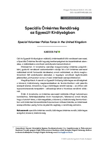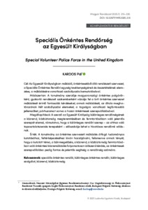 Cél: Az Egyesült Királyságban működő, önkéntesekből álló rendészeti szervezet, a Speciális Önkéntes Rendőri egység tevékenységének és összetételének elemzése, a működésére vonatkozó szabályozás bemutatásával. Módszertan: A tanulmány szerzője magyarországi önkéntes polgárőrként, gyakorló rendészeti szakemberként vázolja fel a brit önkéntes szervezet működését érintő fontosabb kérdéseket, annak működését, az általa meghatározónak ítélt szabályozási elemeket, a tagságra vonatkozó legfontosabb jellemzőket, párhuzamot vonva a hazai önkéntesek szerepvállalásával. Megállapítások: A szerző az Egyesült Királyság különleges rendőrségének a közrend, közbiztonság megteremtésében és fenntartásában való jelentős szerepét elemzi, rámutatva, hogy a különleges rendőri szerep – az ahhoz való tapasztalatszerzés terepeként – előszobája lehet a hivatásos rendőrré válásnak. Érték: A tanulmány az önkéntes szervezeti működés átfogó tudományos kutatásához, feltérképezéséhez kíván hozzájárulni, felismerve annak tényét, hogy a kutatott téma, a bűnmegelőzés, a közrend, a közbiztonság fenntartásában való önkéntesi közreműködés folyamatosan időszerű kérdés, az önkéntesek szerepvállalása pedig fontos és jelentős segítség a rendőrség számára. | Aim: Analysis of the activities and composition of the Special Volunteer Police Unit, a volunteer law enforcement organisation operating in the United Kingdom, with a presentation of the relevant regulations governing its operation. Methodology: As a Hungarian volunteer civil guard and practising law enforcement professional, the author of the study outlines the most important issues affecting the operation of the British volunteer organisation, its functioning, the regulatory elements he considers decisive, and the most important characteristics of membership, drawing parallels with the role of volunteers in Hungary. Findings: The author analyses the significant role played by the United Kingdom’s special police force in establishing and maintaining public order and safety, pointing out that the role of special police officers – as a field in which to gain experience – can be a stepping stone to becoming a professional police officer. Value: The study aims to contribute to a comprehensive scientific research and mapping of voluntary organisational activities, recognising that the topic under investigation, crime prevention, volunteer participation in maintaining public order and public safety is a constantly topical issue, and that the role of volunteers is an important and significant help to the police.
