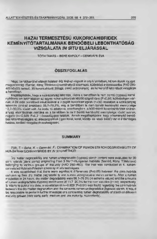 Négy, bendőkanüllel ellátott hoistein-fríz tinóval végzett in situ kísérletben, három észak-nyugatmagyarországl (Sarród, Kóny, Töltéstava) termőhelyről származó, különböző éréscsoportba (FAO 280- 460 között) tartozó, 30 kukoricahibrid (lófogú, dent) szárazanyag- és keményítő lebontását vizsgálták a bendőben. Megállapították, hogy a szárazanyag lebontás, illetve a bendőben le nem bomló (bypass) keményítőtartalom tekintetében az egyes kukoricahibridek között szignifikáns (P<0,05) különbségek vannak. A 24 órás bendőbeli Inkubációval a vizsgált kukoricamagvak (n=30) esetében a szárazanyag lebontás (szélső értékben) 58,7-76,3%, míg a bendőben le nem bomló keményítő mennyisége 13,7-30,3% között volt. Az irodalmi adatokkal összhangban, a különböző kukoricahibridek szárazanyag lebontásának mértéke és a bendőben le nem bomló keményítő mennyisége között szoros, negatív (r=-0,929; P<0,01) összefüggést találtak. Annak megállapítására, hogy a keményítő bendőbeli lebonthatóságára az éréscsoportnak (igen korai, korai, közép- és késői érésű) van-e érdemleges hatása, további vizsgálatok szükségesek.