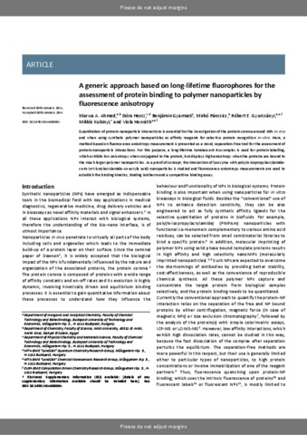 Ahmed, Marwa A. and Hessz, Dóra and Gyarmati, Benjámin and Páncsics, Mirkó and Gyurcsányi, Róbert E. and Kubinyi, Miklós and Horváth, Viola (2024) A generic approach based on long-lifetime fluorophores for the assessment of protein binding to polymer nanoparticles by fluorescence anisotropy. NANOSCALE, 16 (7). pp. 3659-3667. ISSN 2040-3364