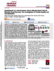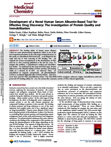 Kenéz, Balázs and Koplányi, Gábor and Decsi, Balázs and Molnár, Zsófia Klára and Horváth, Péter and Katona, Gábor and Balogh, György Tibor and Balogh-Weiser, Diána (2025) Development of a Novel Human Serum Albumin-Based Tool for Effective Drug Discovery: The Investigation of Protein Quality and Immobilization. JOURNAL OF MEDICINAL CHEMISTRY, 68 (3). pp. 2840-2848. ISSN 0022-2623