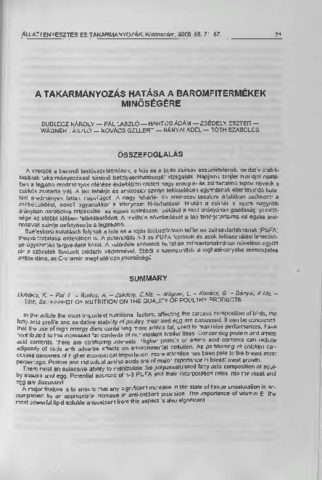 A szerzők a baromfi testösszetételének, a hús és a tojás zsirsav-összetételének, oxidatív stabilitásának takarmányozással történő befolyásolhatóságát vizsgálják. Napjaink brojler hibridjei esetében a legjobb eredmények elérése érdekében etetett nagy energia- és zsírtartalmú tápok növelik a csirkék zsírtartalmát. A táp fehérje és aminosav szintje tekintetében egymásnak ellentmondó kutatási eredmények láttak napvilágot. A nagy fehérje- és aminosav-tartalom általában csökkenti a zsírképződést, növeli ugyanakkor a környezet N-terhelését. Miután a csirkét is egyre nagyobb arányban darabolva értékesítik, az egyes testrészek, például a mell arányának gazdasági jelentősége az utóbbi időben felértékelődött. A mellhús növekedését a táp fehérjetartalma és egyes aminosavak szintje befolyásolja a leginkább. Széleskörű kutatások folynak a hús és a tojás többszörösen telítetlen zsírsavtartalmának (PUFA) megváltoztatása érdekében is. A potenciális n-3-as PUFA források és azok felhasználási lehetősége úgyszintén tárgyalásra kerül. A különféle szövetek telítetlen zsírsavtartalmának növelése együtt jár a szövetek fokozott oxidatív védelmével. Ebből a szempontból a leghatékonyabb természetes antioxidáns, az E-vitamin meghatározó jelentőségű.