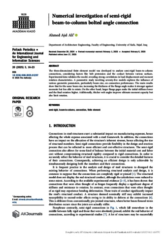 Ali, Ahmed Ajel (2025) Numerical investigation of semi-rigid beam-to-column bolted angle connection. POLLACK PERIODICA: AN INTERNATIONAL JOURNAL FOR ENGINEERING AND INFORMATION SCIENCES, 20 (3). pp. 16-23. ISSN 1788-1994