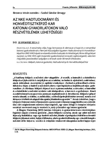 A tanulmány célja, hogy bemutassa és elemezze a hazai és a nemzetközi katonai gyakorlatoknak a Nemzeti Közszolgálati Egyetem Hadtudományi és Honvédtisztképző Kar (NKE HHK) képzési rendszerébe történő adaptációs lehetőségeit, illetve átfogó képet nyújtson az NKE HHK saját levezetésű gyakorlatainak tervezési sajátosságairól, valamint megoldási javaslatokkal szolgáljon a tervezés során felmerült kihívásokra.