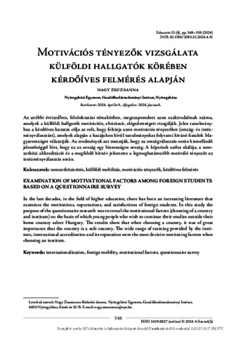 Nagy, Zsuzsanna (2024) Motivációs tényezők vizsgálata külföldi hallgatók körében kérdőíves felmérés alapján = Examination of motivational factors among foreign students based on a questonnaire survey. EDUCATIO, 33 (4). pp. 548-558. ISSN 1216-3384