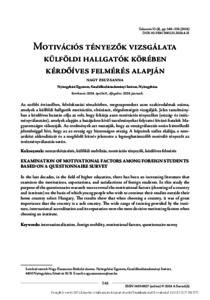 Az utóbbi évtizedben, felsőoktatási témakörben, megszaporodott azon szakirodalmakszáma, amelyek a külföldi hallgatók motivációit, elvárásait, elégedettségeitvizsgálják. Jelen tanulmányban a kérdőíves kutatás célja az volt, hogy feltárjaazon motivációs tényezőket (ország- és intézményválasztást), amelyek alapján ahazájukon kívül tanulmányokat folytatni kívánó fiatalok Magyarországotválasztják. Az eredmények azt mutatják, hogy az országválasztás során kiemelkedőjelentőséggel bírt, hogy az az ország egy biztonságos ország. A képzések szélesskálája, a nemzetközi akkreditáció és a megfelelő hírnév jelentette alegmeghatározóbb motiváló tényezőt az intézményválasztás során. | In the last decades, in the field of higher education, there has been an increasing literature that examines the motivations, expectations, and satisfactions of foreign students. In this study the purpose of the questionnaire research was to reveal the motivational factors (choosing of a country and institute) on the basis of which young people who wish to continue their studies outside their home country select Hungary. The results show that when choosing a country, it was of great importance that the country is a safe country. The wide range of training provided by the institute, international accreditation and its reputation were the most decisive motivating factors when choosing an institute.