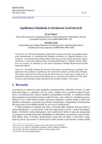 Újvári, Dániel and Németh, László (2024) Apollóniusz-feladatok és körláncok GeoGebrával. DIMENZIÓK: MATEMATIKAI KÖZLEMÉNYEK, 12. pp. 13-23. ISSN 2064-2172