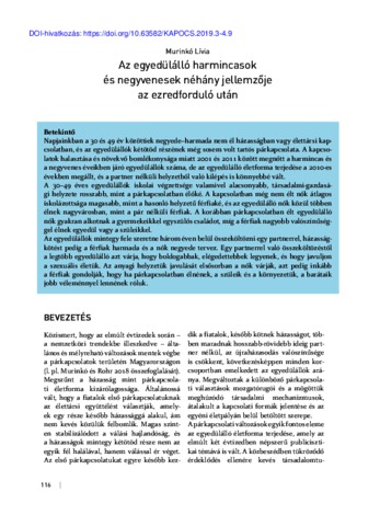 Murinkó, Lívia (2019) Az egyedülálló harmincasok és negyvenesek néhány jellemzője az ezredforduló után = Some Characteristics of Single People in Their Thirties and Forties After the Turn of the Millennium. KAPOCS, 2 (3-4). pp. 116-137. ISSN 1588-7227
