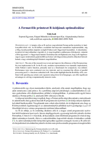 Tóth, Zsolt György (2024) A Fermat-féle prímteszt R-kódjának optimalizálása. DIMENZIÓK: MATEMATIKAI KÖZLEMÉNYEK, 12. pp. 85-90. ISSN 2064-2172