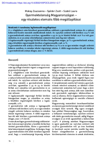Makay, Zsuzsanna and Spéder, Zsolt and Szabó, Laura (2019) Gyermektelenség Magyarországon : egy részletes elemzés főbb megállapításai = Childlessness in Hungary : Key Findings of a Detailed Analysis. KAPOCS, 2 (1-2). pp. 76-79. ISSN 1588-7227