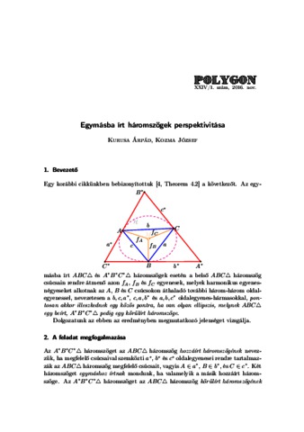 Kurusa, Árpád and Kozma, József (2016) Egymásba írt háromszögek perspektivitása. POLYGON, Matematikai, szakdidaktikai Közlemények, 24 (1). pp. 1-12.