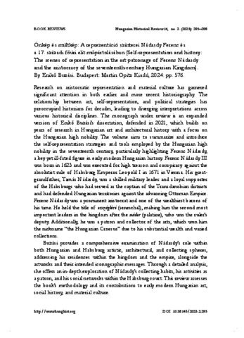 Márton, Andrea (2025) Önkép és múltkép: A reprezentáció színterei Nádasdy Ferenc és a 17. századi főúri elit műpártolásában [Self-representation and history: The scenes of representation in the art patronage of Ferenc Nádasdy and the aristocracy of the seventeenth-century Hungarian Kingdom]. By Enikő Buzási. Budapest: Martin Opitz Kiadó, 2024. pp. 576. THE HUNGARIAN HISTORICAL REVIEW, 14 (2). pp. 295-298. ISSN 2063-8647 (print); 2063-9961 (online)