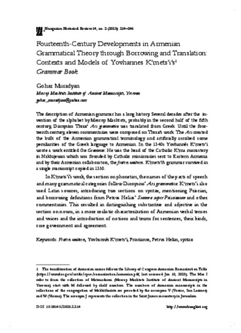 Muradyan, Gohar (2025) Fourteenth-Century Developments in Armenian Grammatical Theory through Borrowing and Translation: Contexts and Models of Yovhannes K‘r.nets‘i’s1 Grammar Book. THE HUNGARIAN HISTORICAL REVIEW, 14 (2). pp. 214-246. ISSN 2063-8647 (print); 2063-9961 (online)