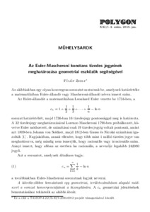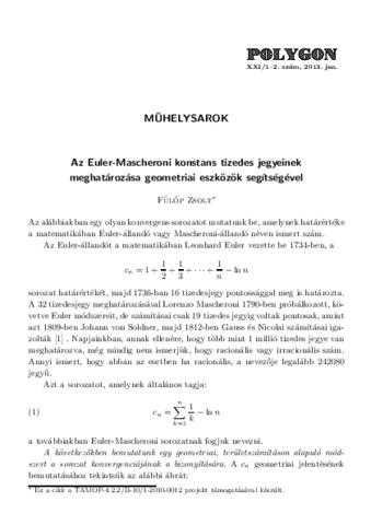 Fülöp Zsolt, Zsolt (2013) Az Euler-Mascheroni konstans tizedes jegyeinek meghatározása geometriai eszközök segítségével. POLYGON, Matematikai, szakdidaktikai Közlemények, 21 (1-2). pp. 75-82.