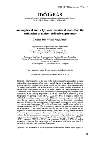 Gombos, Béla and Nagy, János (2024) An empirical and a dynamic-empirical model for the estimation of maize seedbed temperature. IDŐJÁRÁS = QUARTERLY JOURNAL OF THE HUNGARIAN METEOROLOGICAL SERVICE, 128 (1). pp. 41-57. ISSN 0324-6329 (print); 2677-187X (online)