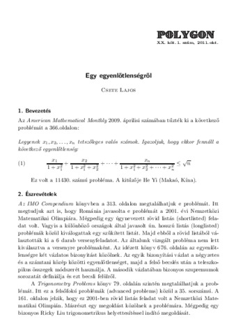 Csete, Lajos (2011) Egy egyenlőtlenségről. POLYGON, Matematikai, szakdidaktikai Közlemények, 20 (1). pp. 33-38.