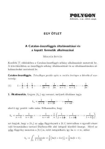 Molnár, István (2010) A Catalan-összefüggés általánosításai és a kapott formulák alkalmazásai. POLYGON, Matematikai, szakdidaktikai Közlemények, 19 (1). pp. 63-76.