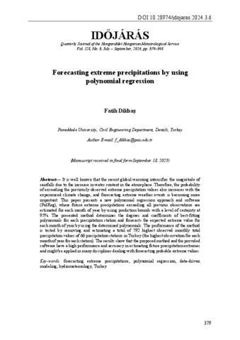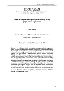 Dikbaş, Fatih (2024) Forecasting extreme precipitations by using polynomial regression. IDŐJÁRÁS = QUARTERLY JOURNAL OF THE HUNGARIAN METEOROLOGICAL SERVICE, 128 (3). pp. 379-398. ISSN 0324-6329 (print); 2677-187X (online)