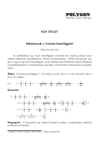 Molnár, István (2008) Alkalmazzuk a Catalan-összefüggést! POLYGON, Matematikai, szakdidaktikai Közlemények, 17 (1-2). pp. 125-134.