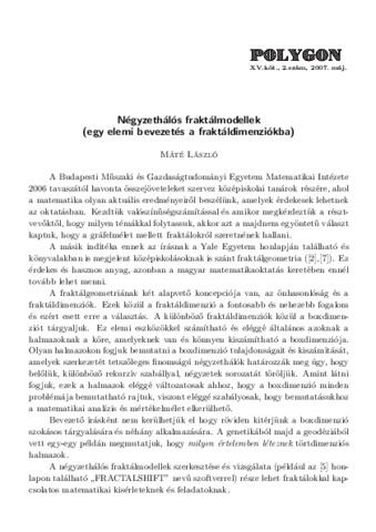 Máté, László (2007) Négyzethálós fraktálmodellek (egy elemi bevezetés a fraktáldimenziókba). POLYGON, Matematikai, szakdidaktikai Közlemények, 15 (2). pp. 25-42.