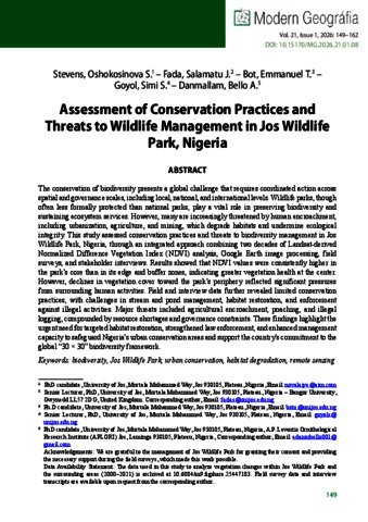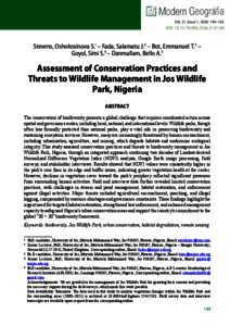 Stevens, Oshokosinova S. and Fada, Salamatu J. and Bot, Emmanuel T. and Goyol, Simi S. and Danmallam, Bello A. (2026) Assessment of conservation practices and threats to wildlife management in Jos Wildlife Park, Nigeria. MODERN GEOGRÁFIA, 21 (1). pp. 149-162. ISSN 2062-1655 (In Press)