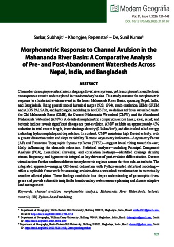 Sarkar, Subhajit and Khongjee, Repenstar and De Sunil, Kumar (2026) Morphometric response to channel avulsion in the Mahananda River Basin: A comparative analysis of pre- and post-abandonment watersheds across Nepal, India, and Bangladesh. MODERN GEOGRÁFIA, 21 (1). pp. 121-148. ISSN 2062-1655 (In Press)