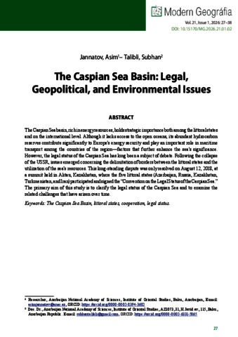 Jannatov, Asim and Talibli, Subhan (2026) The Caspian Sea basin: Legal, geopolitical, and environmental issues. MODERN GEOGRÁFIA, 21 (1). pp. 27-38. ISSN 2062-1655 (In Press)
