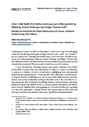 Szentkereszti, Máté (2025) Grün in der Stadt. Vom Hortus conclusus zum Urban gardening. Edited by Andrea Pühringer and Holger Thomas Gräf.: Beiträge zur Geschichte der Städte Mitteleuropas 30. Vienna–Innsbruck: Studien Verlag, 2023. 408 pp. HISTORICAL STUDIES ON CENTRAL EUROPE, 5 (1). pp. 284-287. ISSN 2786-0930