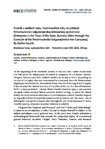 Izsák, Gergely (2025) Podnik v osídlach štátu. Podnikateľské elity na príklade Rimamuránsko-šalgotarjánskej železiarskej spoločnosti [Enterprise in the Traps of the State. Business Elites through the Example of the Rimamuránsko-Šalgotarjánská Iron Company]. By Štefan Gaučík. : Bratislava: Veda, vydavateľstvo SAV – Historický ústav SAV, 2020. 278 pp. HISTORICAL STUDIES ON CENTRAL EUROPE, 5 (1). pp. 288-292. ISSN 2786-0930