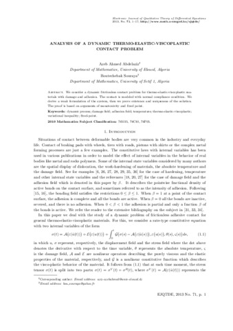 Ahmed, AbdelazizAzeb and Boutechebak, Souraya (2013) Analysis of a dynamic thermo-elastic-viscoplastic contact problem. Electronic Journal of Qualitative Theory of Differential Equations, 2013 (71). pp. 1-17. ISSN 1417-3875
