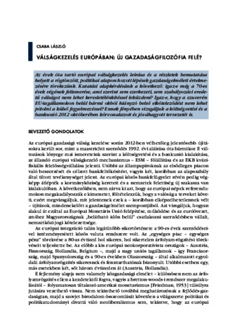 Az évek óta tartó európai válságkezelés leírása és a részletek bemutatása helyett a rögtönzött, politikai alapon hozott lépések gazdaságelméleti értelmezésére törekszünk. Kutatási alapkérdésünk a következő: igaz-e még a 70-es évek végének felismerése, ami szerint sem szerkezeti, sem szabályozási eredetű válságot nem lehet keresletélénkítéssel leküzdeni? Igaz-e, hogy a szuverén EU-tagállamokon belül bármi okból hiányzó belső elköteleződést nem lehet pótolni a külső fegyelmezéssel? Ennek fényében vizsgáljuk a költségvetési és a bankunió 2012 októberében körvonalazott és jóváhagyott tervezetét is.