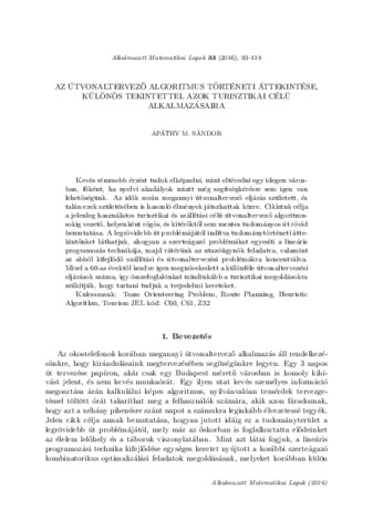 Apáthy, M. Sándor (2016) Az útvonaltervező algoritmus történeti áttekintése különös tekintettel azok turisztikai célú alkalmazásaira. ALKALMAZOTT MATEMATIKAI LAPOK, 33. pp. 93-118. ISSN 0133-3399