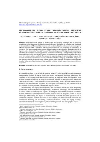 Veres, Péter and Umetaliev, Akylbek and Bányai, Tamás and Gombár, Boglárka and Tamás, Péter (2024) Micromobility revolution : Recommending efficient restaurant delivery systems in Hungary and Kyrgyzstan. ADVANCED LOGISTIC SYSTEMS: THEORY AND PRACTICE, 18 (4). pp. 30-40. ISSN 1789-2198