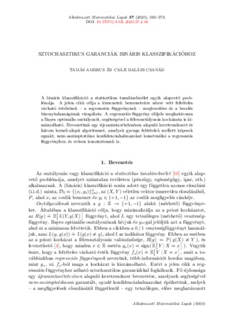Tamás, Ambrus and Csáji, Balázs Csanád (2020) Sztochasztikus garanciák bináris klasszifikációhoz. ALKALMAZOTT MATEMATIKAI LAPOK, 37. pp. 365-379. ISSN 0133-3399
