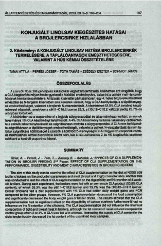 A szerzők Ross 308 genotípusú kakasokkal végzett brojlerhlzlalási kísérletben azt vizsgálták, hogy a CLA kiegészítés milyen hatást gyakorol a hizlalási eredményekre, valamint a csirkék mell- és combhúsának kémiai összetételére. A hizlalási kísérlettel párhuzamosan, egy 4. hetes brojlerekkel beállított emésztési és N-forgalmi kísérletben arra kerestek választ, hogy a CLA befolyásolja-e a táplálóanyagok emészthetőségét, valamint a brojlerek N-visszatartását. A kísérleteket 53,5% CLA tartalmú készítménnyel végezték, amelyben a c9t11-C18:2 izomer 26,3, a t10c12-C18:2 változat pedig 25,7%-os arányban fordult elő. A kísérletben az a csoport érte el a legjobb súlygyarapodást és takarmányhasznosítást, amelynek takarmánya 1 % CLA készítményt tartalmazott. A 4% CLA készítmény tartalmú takarmány csökkentette a csirkék takarmányfelvételét és szignifikánsan rontotta a súlygyarapodást. A CLA nem befolyásolta szignifikánsan a táplálóanyagok emészthetőségét, valamint a csirkék N-visszatartását és nem találtak szignifikáns különbséget a szerzők a különböző mennyiségű CLA-t fogyasztó csoportok combés mellhúsának kémiai összetétele között sem, bár a hús zsírtartalma 2 és 4% kiegészítés esetében csökkent a kontroll csoporthoz képest.