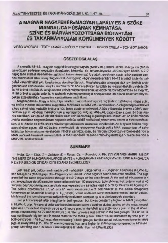 A szerzők 12-12, magyar nagyfehérxmagyar lapály (MNFxML), illetve szőke mangalica (MÁN) genotípusú sertéssel végeztek vizsgálatot, biotartási és -takarmányozási körülmények között. A 217 napig tartó etetési kísérletben egyfázisú takarmányozást folytattak, amelynek során a két csoport azonos összetételű takarmányt fogyasztott. A vizsgálat végén kezelésenként 10-10 állatból jobb- és baloldali karajmintákat (m. longissimus dorsi) gyűjtöttek. Meghatározták a karajminták pH-értékét a vágást követő első órában, majd a mintákat 5 °C hőmérsékleten tartották és megismételték a mérést 24 és 48 órával később. A karajszeletek színét műszerrel mérték az előbbi három időpontban és még 72, ill. 96 órával a vágás után is. A szeletek márványozottságát a vágás után 48 órával készített fényképeken sztenderdhez hasonlítva szubjektiven bírálták el. Megállapították, hogy a hús pH-ja mindkét csoportban hasonló mértékben csökken a vágás után, de értéke minden időpontban nagyobb a MÁN mint az MNFxML sertésekben. A világosság kivételével a hús színét leíró mutatók értéke a hús érése során emelkedett. A hús világosság értéke a MÁN csoportban a p.m. 48 órás méréskor volt a legnagyobb, míg az MNFxML csoportban a p.m. 24 órás mérés esetében. Az utolsó két méréskor nem volt különbség a genotípusok között. Az a* érték minden mérés esetében szignifikánsan nagyobb volt és az idő múlásával jobban emelkedett a MÁN sertésekben. A b* értéke az érés során mindkét genotípusban azonosan emelkedett. Az árnyalat fokban megadott értéke a p.m. idő múlásával emelkedett, de mindenkor kisebb volt a MÁN csoportban. A színintenzitás folyamatosan növekedett mindkét genotípusban, és minden időpontban erőteljesebb volt a MÁN sertések húsának színeződése. A MÁN sertések húsának márványozottsága 1,5-szerese volt a MNFxML sertésekének.