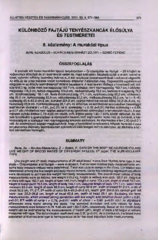 A szerzők két hazai muraközi típusú tenyészetben - Őriszentpéter és Nyőgér - 20 kifejlett tenyészkanca élősúlyát és 21 testméretét vették fel, majd értékelték. Meghatározták a relatív testméreteket, valamint néhány testarány indexet is. A két tenyészet összehasonlítását t-próbával végezték. Az élősúly és a testméretek között korrelációs értékeket határoztak meg. Regressziós egyenleteket dolgoztak ki az élősúly testméretekből történő becslésére. A testméretek főátlaga a következő volt; élősúly 649,3 kg, bottal mért marmagasság 153,7 cm, szalaggal mért marmagasság 162,7 cm, hátközépmagasság 146,3 cm, farbúb-magasság 154,6 cm, mellkasmélység 75,2 cm, bielerpcnt-magasság 78,5 cm, törzshosszúság 166,1 cm, ferde törzshosszúság 171,1 cm, nyakhosszúság 82,2 cm, háthosszúság 85,0 cm, farhosszúság 53,9 cm, vállszélesség 51,2 cm. mellkasszélesség 56,2 cm, far I.- Il.-lll. szélesség 63,4-60,2-24,9 cm, övméret 204,9 cm, szárkörméret bal mellső-hátsó 22,2-24,8 cm, fejhosszúság 63,8 cm. homlokszélesség 25,1 cm. Az élősúllyal és kondícióval szorosabban összefüggő testméretek (övméret r » 0,91, p<0,01; far II. szélesség r = 0,78; p<0,01; mellkas szélesség r = 0,89; p<0,01 stb.) kivételével nem találtak statisztikailag igazolható különbséget a tenyészetek között. A testméretek szórás értékei 0,73-9,65 cm között. cv% értékei pedig 1.92-7,63% között változtak. Az élősúly becslésére a gyakorlatban is könnyedén használható regressziós modellhez az övméret, a háthosszúság és a szalaggal mért marmagasság ismerete szükséges. Az illeszkedési érték 0,90 (p<0,01) volt. Az eredmények alapján megállapítható, hogy a hazánkban tenyészetett, kifejlett muraközi típusú tenyészkanca állomány testméreteiben számottevő különbségek nem mutatkoztak, az állomány a küllem tekintetében homogén.