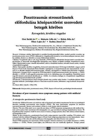 Bevezetés: A középarc sérülése funkcionális és esztétikai következményekkel járhat, amelyek pszichés zavarokat, így poszttraumás stressz-zavart (PTSD) válthatnak ki. A legjellemzőbb tünetek az orvosi kényszerképzet (intrusio, kéretlen emlékek, álmok) és az elkerülés (a trauma felidézésének kerülése). Célkitűzés: Vizsgálatunk célja az volt, hogy felmérjük a PTSD-tünetek előfordulását középarctörést szenvedett betegek körében, és elemezzük összefüggéseiket demográfiai (nem, életkor) és klinikai (etiológia, hospitalizáció) tényezőkkel. Hipotézisünk szerint a tünetek súlyosabbak a nők és a fiatalabbak körében, erőszakos trauma esetén, valamint a hospitalizált betegeknél. Módszer: Retrospektív, kérdőíves vizsgálatban, kvótaszerű mintaválasztással, 116 beteget értékeltünk a magyar nyelvű Impact of Event Scale (Események Hatása Kérdőív) segítségével; az alcsoportarányok nem reprezentatívak. Az intrusio és az elkerülés alskálák belső konzisztenciáját, valamint a demográfiai és a klinikai tényezők hatását vizsgáltuk. Eredmények: A betegek 33,6%-a számolt be PTSD-tünetekről. A belső konzisztencia kiváló volt (intrusio: α = 0,915; elkerülés: α = 0,933). A nők nagyobb pontszámot értek el, de a különbség nem volt szignifikáns. Fiatalabbak esetén nagyobb intrusiós pontszámok jelentkeztek (p = 0,046). Az erőszakos etiológia és a hospitalizáció szignifikánsan nagyobb tünetpontszámokkal társult (p<0,05). Következtetés: A középarctörésen átesett betegek jelentős része pszichés terhet hordoz. A multidiszciplináris ellátás részeként indokolt a pszichológiai szűrés és a korai intervenció bevezetése, különösen a nagy kockázatú alcsoportokban. | Introduction: Midfacial fractures can result not only in functional and aesthetic impairments but also in psychological disorders, including post-traumatic stress disorder (PTSD). The most characteristic symptoms are intrusion (unwanted memories, dreams) and avoidance (efforts to evade trauma-related reminders). Objective: The aim of this study was to assess the prevalence of PTSD symptoms among patients with midfacial fractures and to analyze their associations with demographic (sex, age) and clinical (etiology, hospitalization) factors. We hypothesized that symptoms would be more severe in women, younger patients, those with violence-related injuries, and hospitalized cases. Method: In this retrospective, questionnaire-based study, using purposive (quota-like) sampling, 116 patients were evaluated with the validated Hungarian Impact of Event Scale; subgroup proportions are non-representative. Internal consistency of the subscales and the influence of demographic and clinical factors were analyzed. Results: PTSD symptoms were reported by 33.6% of patients. Internal consistency was excellent (intrusion α = 0.915; avoidance α = 0.933). Women scored higher, but differences were not statistically significant. Younger patients showed significantly higher intrusion scores (p = 0.046). Violence-related etiology and hospitalization were both significantly associated with higher intrusion and avoidance scores (p<0.05). Conclusion: A considerable proportion of patients experience long-term psychological burden after midfacial fractures. Psychological screening and early intervention should be integrated into multidisciplinary maxillofacial care, especially in high-risk subgroups.