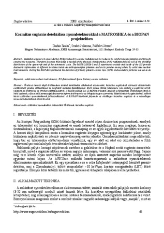 Dudás, Beáta and Szabó, Julianna and Pálfalvi, József (2008) Kozmikus sugárzás detektálása nyomdetektorokkal a MATROSHKA és a BIOPAN projektekben. SUGÁRVÉDELEM, 1 (1). pp. 44-50. ISSN 2060-2391