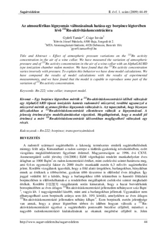 Győrfi, Tamás and Csige, István (2009) Az atmoszférikus légnyomás változásainak hatása egy borpince légterében lévő 222Rn-aktivitáskoncentrációra. SUGÁRVÉDELEM, 2 (1). pp. 44-49. ISSN 2060-2391