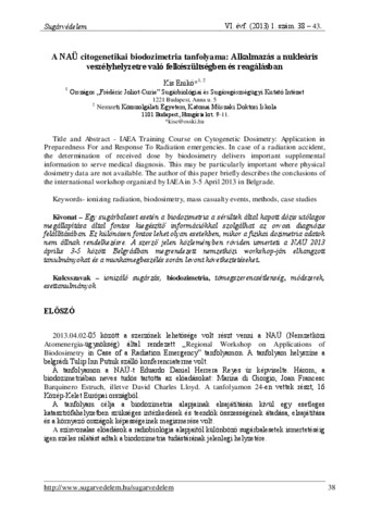 Kis, Enikő (2013) A NAÜ citogenetikai biodozimetria tanfolyama: Alkalmazás a nukleáris veszélyhelyzetre való felkészültségben és reagálásban. SUGÁRVÉDELEM, 6 (1). pp. 38-43. ISSN 2060-2391