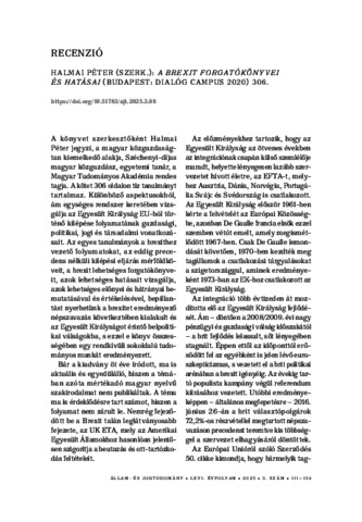 Marosi, György Csongor (2025) Halmai Péter (szerk.): A brexit forgatókönyvei és hatásai (Budapest: Dialóg Campus 2020) 306. ÁLLAM- ÉS JOGTUDOMÁNY, 66 (3). pp. 111-119. ISSN 0002-564X