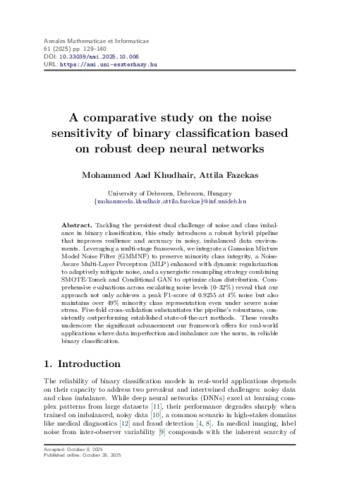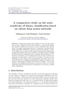 Khudhair, Mohammed Aad and Fazekas, Attila (2025) A comparative study on the noise sensitivity of binary classification based on robust deep neural networks. ANNALES MATHEMATICAE ET INFORMATICAE, 61. pp. 129-140. ISSN 1787-6117