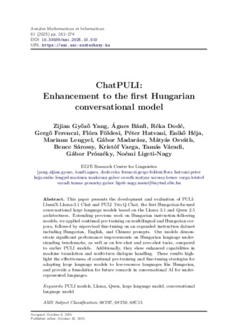 Yang, Zijian Győző and Bánfi, Ágnes and Dodé, Réka and Ferenczi, Gergő and Földesi, Flóra and Hatvani, Péter and Héja, Enikő and Lengyel, Mariann and Madarász, Gábor and Osváth, Mátyás and Sárossy, Bence and Varga, Kristóf and Váradi, Tamás and Prószéky, Gábor and Ligeti-Nagy, Noémi (2025) ChatPULI: Enhancement to the first Hungarian conversational model. ANNALES MATHEMATICAE ET INFORMATICAE, 61. pp. 261-274. ISSN 1787-6117