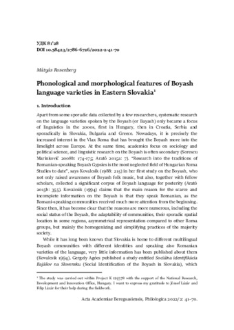 Rosenberg, Mátyás (2022) Phonological and morphological features of Boyash language varieties in Eastern Slovakia = Фонологічні та морфологічні особливості говорів беашів Східної Словаччини. ACTA ACADEMIAE BEREGSASIENSIS, PHILOLOGICA, 1 (2). pp. 41-70. ISSN 27866718