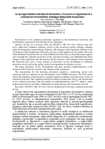 Taba, Gabriella and Kári, Béla (2017) Az új sugárvédelmi szabályozás bevezetése a Semmelweis Egyetemen és a szabályozás bevezetéséhez szükséges fejlesztések bemutatása. SUGÁRVÉDELEM, 10 (1). pp. 57-66. ISSN 2060-2391